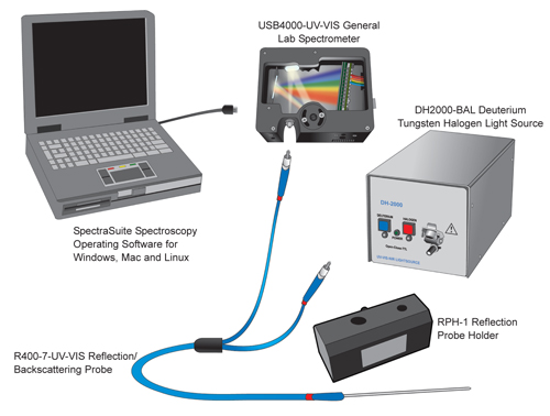 The R400-7-UV-VIS Reflection Probe measures diffuse or specular reflectance from surfaces, or backscattering from translucent materials and fluids. The RPH-1 Probe Holder positions the R400-7 at either 45?for diffuse reflection or 90?for specular reflection. (For reflection measurements with an integrating sphere, click here.) For illumination, we recommend the DH2000-BAL Deuterium Tungsten Halogen Light Source. If your application requires portability, use the smaller DT-MINI-2 Deuterium Tungsten Halogen Light Source. (Because the DT-MINI-2 is a low-power source, configure your spectrometer with a 50 m Slit and an L4 Detector Collection Lens.)
