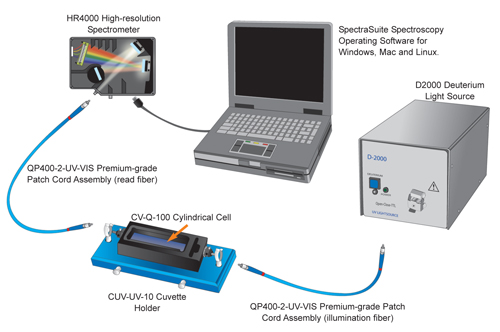 The 10-cm pathlength CUV-UV-10 Cuvette Holder, the CV-Q-10 Cylindrical Cell and QP400-025-SR Premium-grade Solarization-resistant Optical Fibers (one fiber illuminates, the other reads signal) comprise the systems sampling optics. For applications requiring shorter pathlengths or open-air monitoring, use an optical fibers-and-collimating lenses configuration.