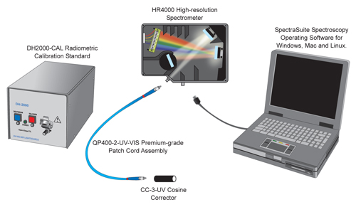 he spectrometer connects to a patch cord that screws into the CC-3-UV Cosine Corrector. The CC-3-UV can be used as part of a configuration for measuring absolute spectral irradiance. Youll need a DH2000-CAL (or LS-1-CAL for 300-1050 nm only) to calibrate the absolute spectral response of the system and SpectraSuite Spectroscopy Operating Software to calculate spectral intensity and photopic data in lumens, lux or candela. An alternative to the CC-3-UV is a Gershun tube, which has fixtures for adjusting the area of light from 1?to 28?and attaches directly to the spectrometer or to an optical fiber.